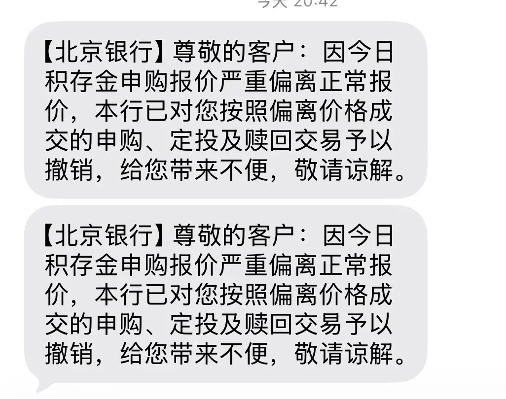 从投资者的交易流水来看,此次划扣操作十分直接:陈女士的账户在18时26分44秒,有251238.69元资金被全额扣划,交易类型标注为“支出”,对方名称为“待划转积存金业务款项”,划扣机构为北京银行股份有限公司资金运营中心;上海的张女士账户内剩余的40001元资金,也在18时31分被全额划走,账户余额一度清零。直至当日20时42分,北京银行才向涉事投资者发送短信,解释因积存金申购报价“严重偏离正常报价”,已对按照该价格成交的申购、定投及赎回交易予以单方面撤销。20时52分左右,银行又通过“冲正”的方式,将投资者最初买入积存金的本金,如3200元、320元等,陆续退回至投资者储蓄卡内。
